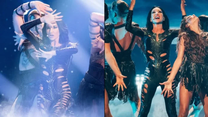 W kolejnych zdaniach nawiązała do swojej pamiętnej scenografii. Gwiazda unosiła się nad sceną dzięki specjalnym uprzężom, co było jednym z najbardziej komentowanych elementów jej występu. Artystka żartobliwie dodała, że w 2035 roku liczy na jeszcze większy technologiczny postęp.